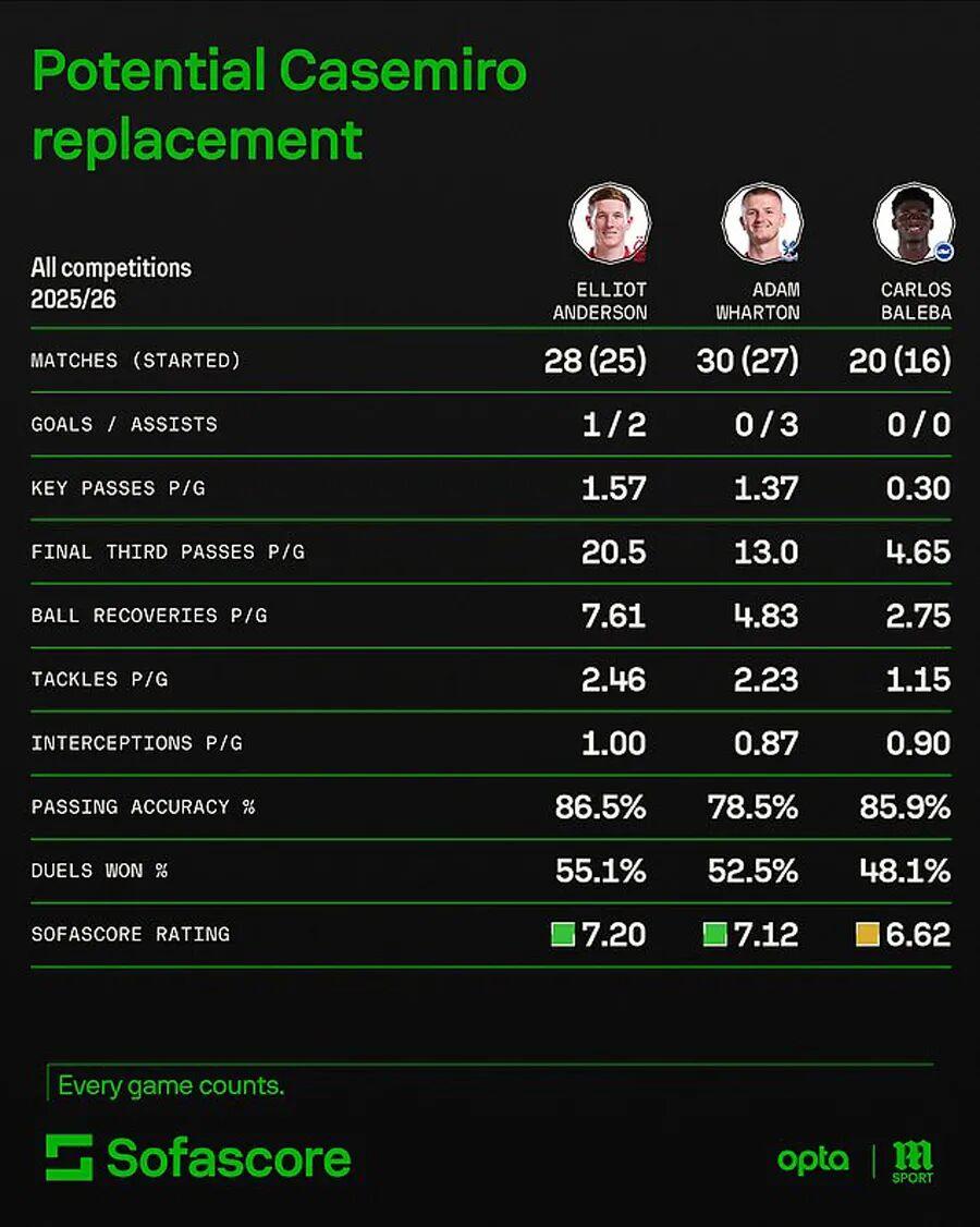 曼联卡塞米罗替代者候选曝光!卡里克仍想冬窗引援,一人去留关键